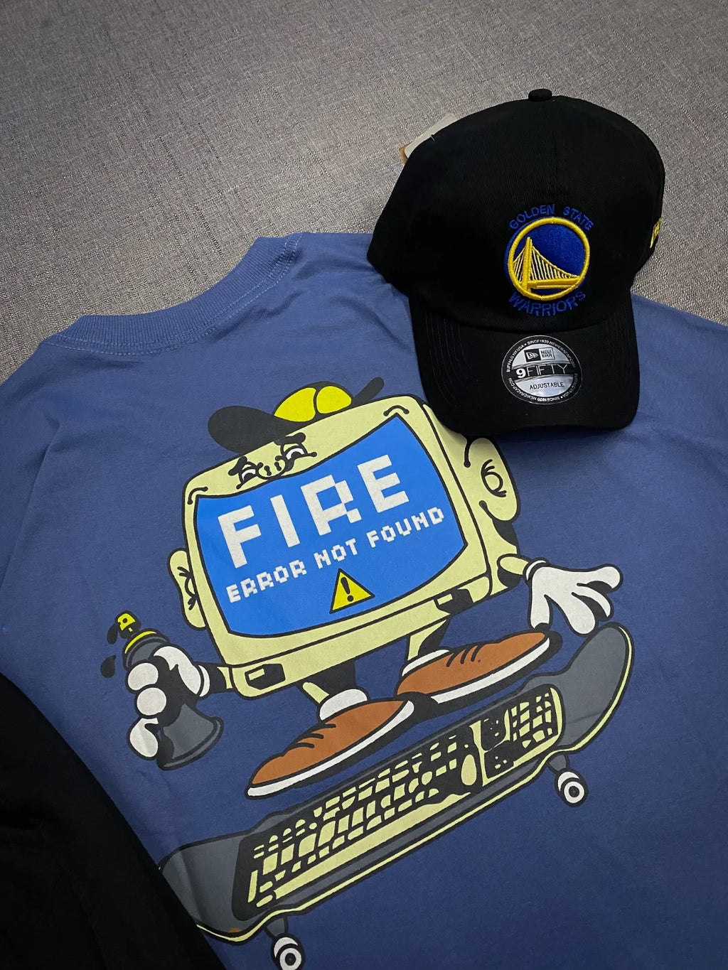 A camiseta azul com estampa “error not found” entrega personalidade e referência street/digital, enquanto a calça preta equilibra o look com sobriedade e versatilidade. O boné finaliza o conjunto com identidade urbana e leitura imediata de estilo.