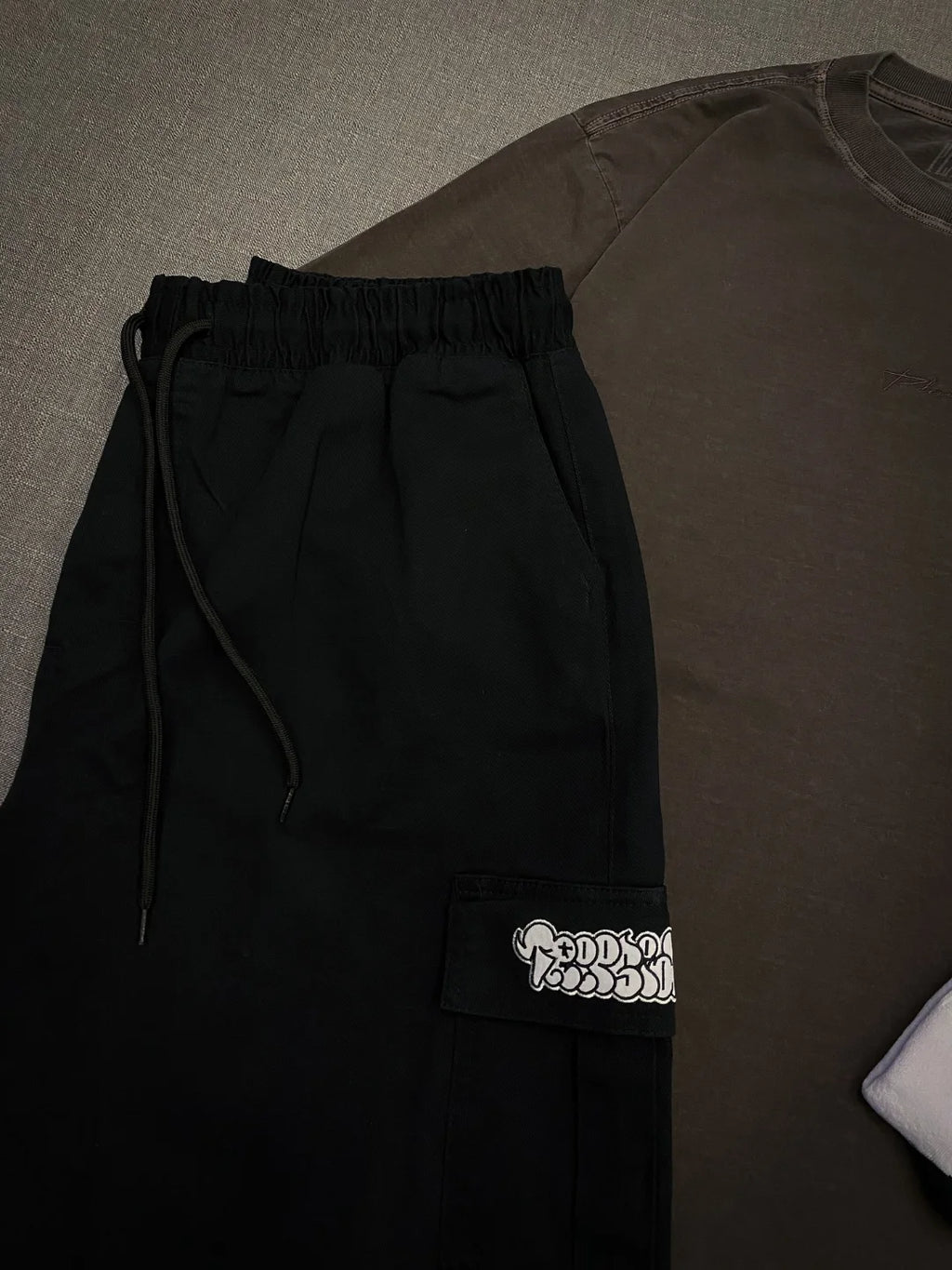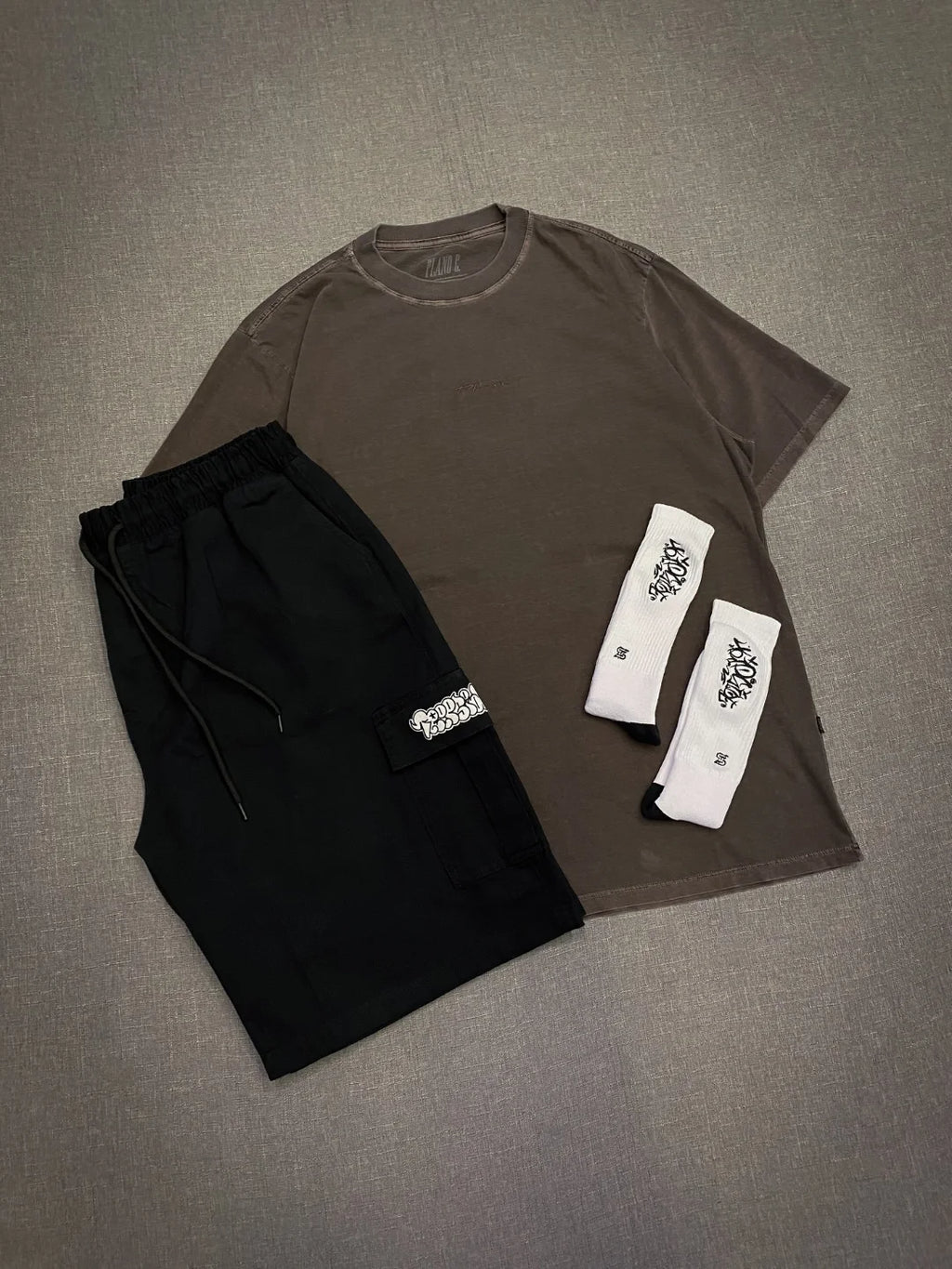 A camiseta em tom marrom traz uma estética clean e sofisticada, enquanto a bermuda preta garante conforto e versatilidade. As meias completam o conjunto com um detalhe de identidade que eleva o look sem exagero.